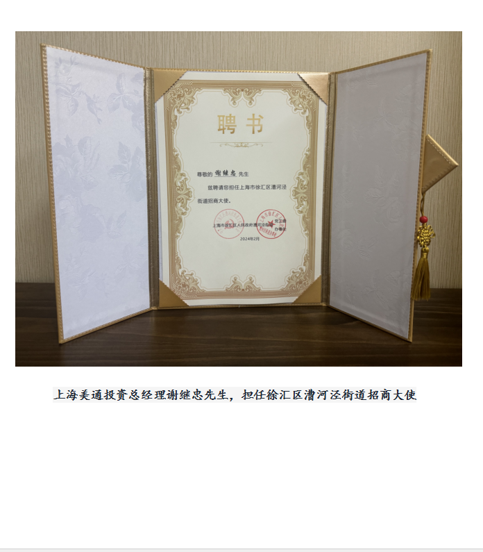 上(shàng)海(hǎi)美(měi)通(tōng)投資總經理(lǐ)謝(xiè)繼忠先生(shēng),擔任徐彙區(qū)漕河(hé)泾街(jiē)道(dào)招商大(dà)使